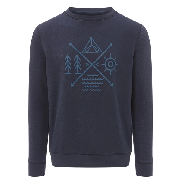 Das Sweatshirt besteht aus einem schnelltrocknenden Baumwoll-Polyester-Gemisch und hat einen angenehm weichen, natürlichen Materialgriff. Die Innenseite ist aufgebürstet und liegt dadurch kuschelig weich auf der Haut. Durch die breiten, elastischen Bündchen an den Ärmel und am Saum und durch den legeren Schnitt sitzt der Pullover immer äußerst bequem, ob am Lagerfeuer oder zu Hause auf der Couch.