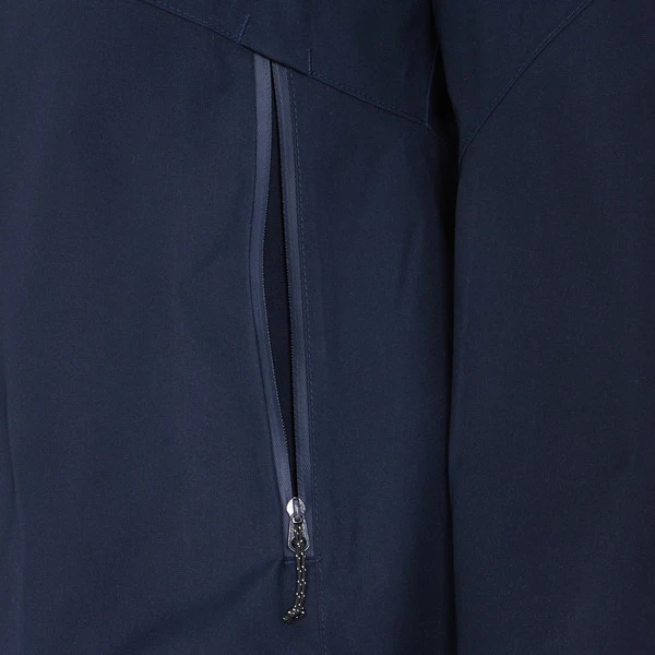 Das robuste Außenmaterial hat einen kräftigen, aber dennoch angenehm weichen Griff. Dadurch fühlt sich die Jacke eher wie eine komfortable Übergangsjacke an als eine Regenjacke. Und dennoch: Das Material ist dank seiner PU-Beschichtung zuverlässig wind- und wasserdicht. Die PFC-freie Imprägnierung verhindert währenddessen, dass Nässe überhaupt erst in das Material eindringen kann.